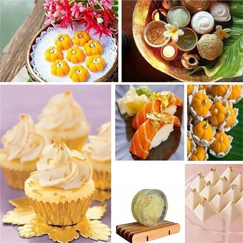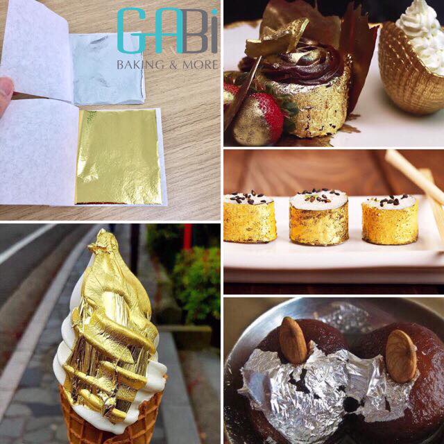 Xu hướng trang trí thực phẩm dát vàng đang ngày càng phổ biến, giúp tăng thêm vẻ sang trong, độc đáo, bắt mắt cho món ăn, đồ uống. Giấy dát vàng giúp trang trí bánh, món tráng miệng một cách tiện lợi, nhanh chóng.
