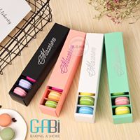 Hộp giấy có ngăn chia đựng 6 bánh macaron.