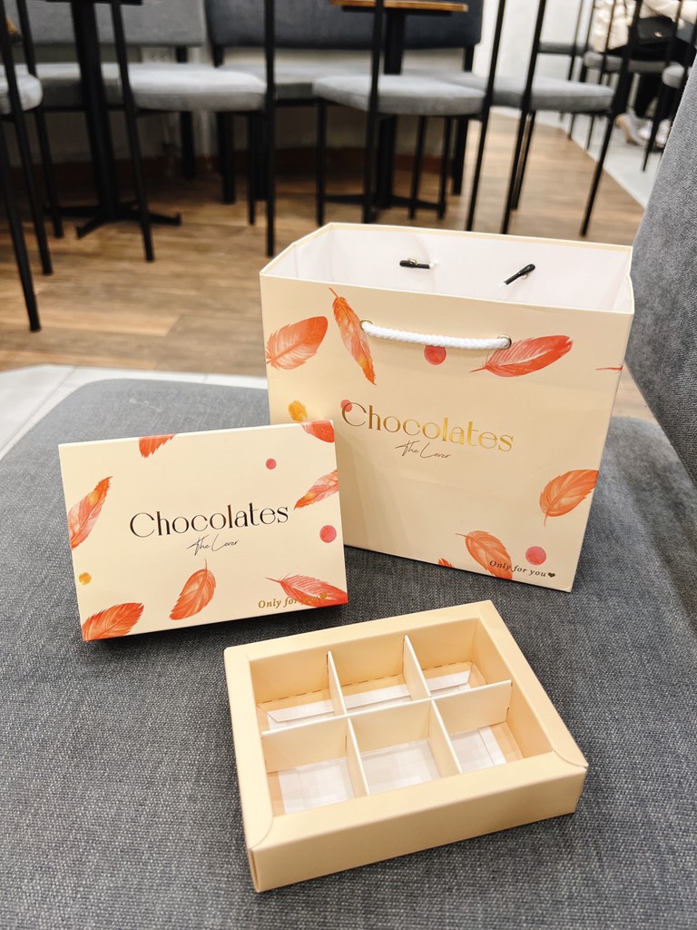 Hộp dùng để đựng socola viên, truffle, nama. Hộp có thiết kế đơn giản nhưng vẫn không kém phần độc đáo, bắt mắt.