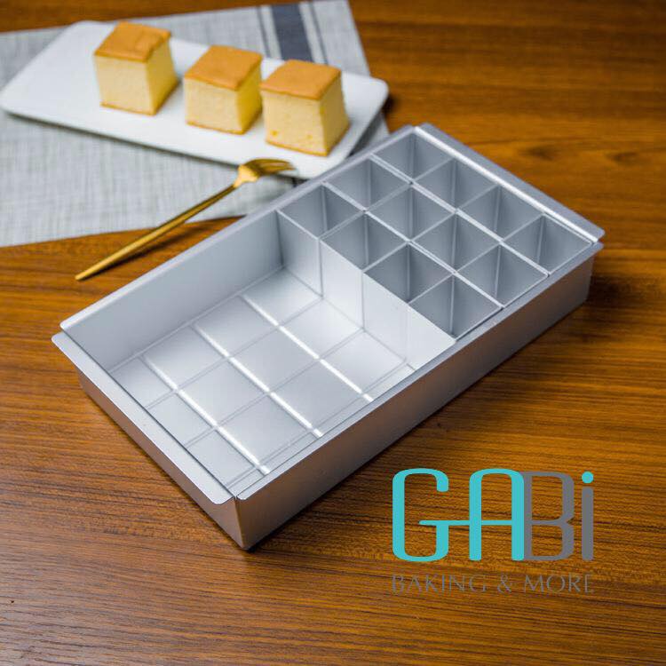 Khuôn chữ nhật, có các ô vuông nhỏ để xếp tạo hình bánh chữ, số