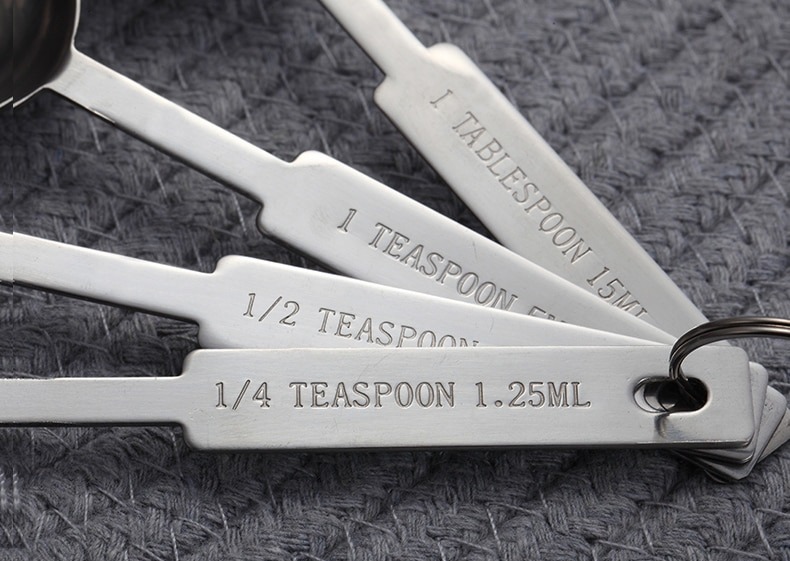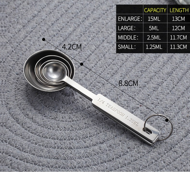 - Sản phẩm gồm 4 chiếc thìa với 4 kích thước khác nhau từ nhỏ đến lớn với 2 hệ đo lường ml và tsp.