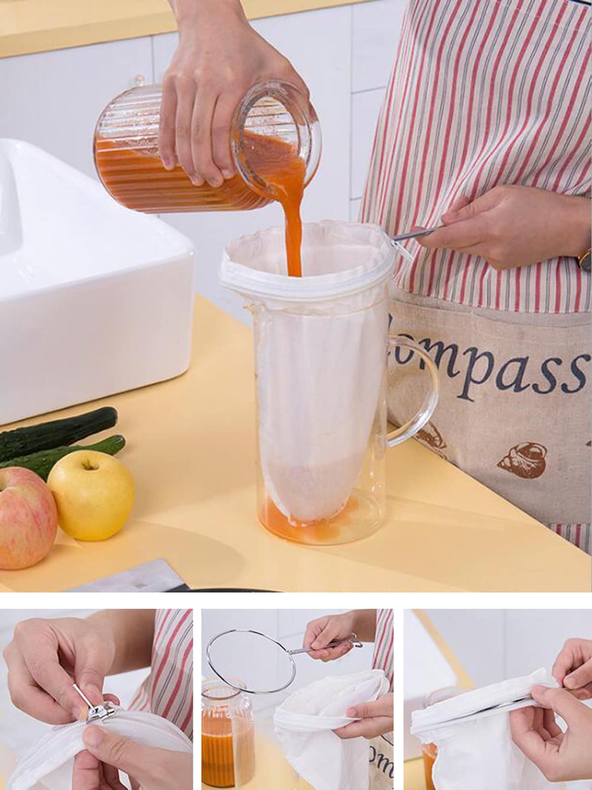 Sản phẩm gồm 2 bộ phận: vòng thép không gỉ + túi lọc bằng vải (có thể dùng riêng)
